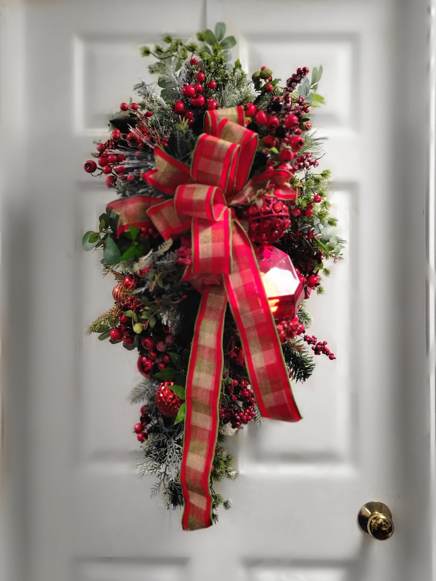 Bring festive warmth to your home with our Holiday Berry Glow wreath. Bursting with vibrant red berries, frosted greenery, and shimmering ornaments, this handcrafted design is finished with a bold red plaid bow for a classic Christmas touch. Perfect for doors, entryways, or above the mantel, this wreath adds a welcoming glow of holiday cheer wherever it’s displayed.