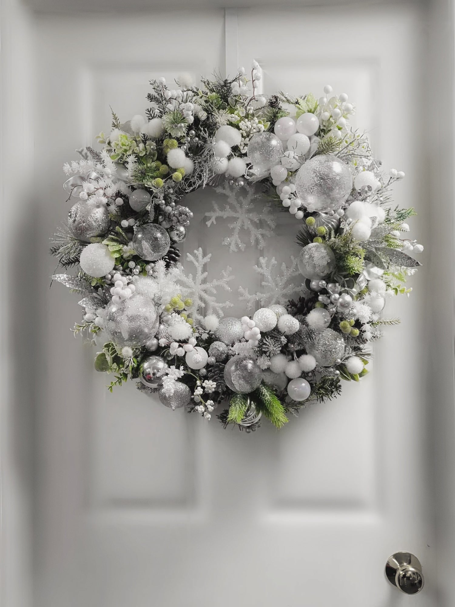 Capture the magic of a snowy winter morning with The First Winter Snow wreath. This elegant design shimmers with frosted greenery, sparkling ornaments, and soft white accents that feels like freshly fallen snow. Silver baubles, snow-kissed berries, and delicate textures that bring a touch of timeless winter beauty to your home.